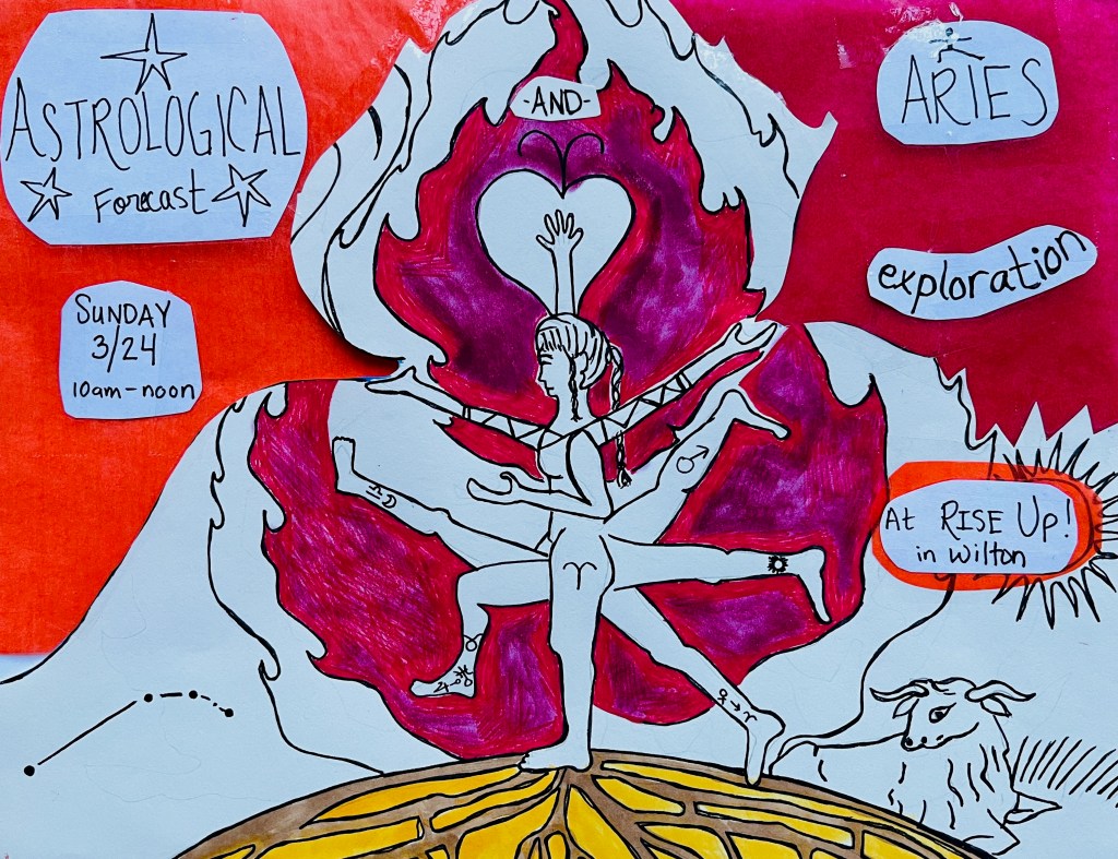 How can we dance, engage, and play with planetary archetypes and energies in our own lives? Here we’ll do it through art, movement, myth, creation, community, and exploration. After the Astrological Forecast, we’ll work with the sign the Sun is currently transiting. This time: Aries! Through experiential and experimental co-creation, we will explore the sign’s themes and what it is to engage and embody them.