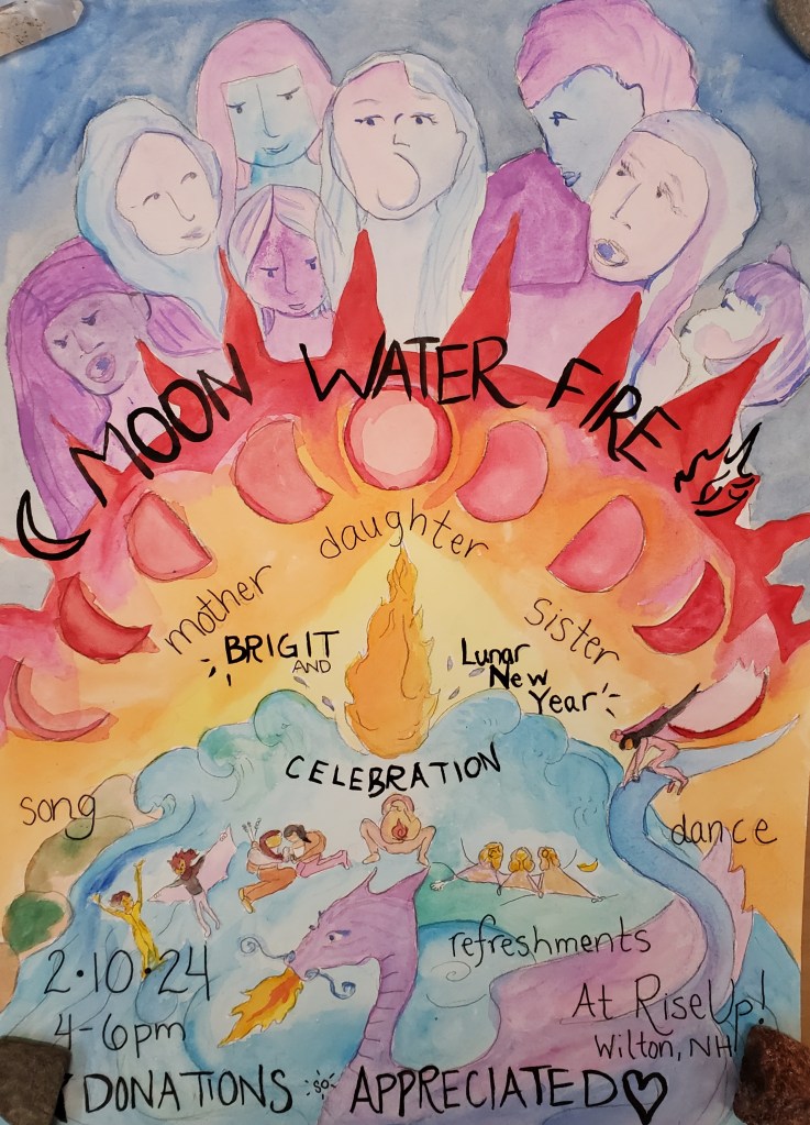 Please join us for circle, song, creation and dance followed by refreshments and time to hang out, play, and connect. As we celebrate Brigit, the mid-point between Solstice and the Spring Equinox, we will honor the well and water along with fire and the flame. Our gathering (magically!) just happens to fall on the lunar new year, heralding 2024 as the year of the dragon. Through dance, song, and co-creation, we will weave an experiential exploration of this season, the noticeable lengthening of days, and tune in with the moon and lunar rhythms.